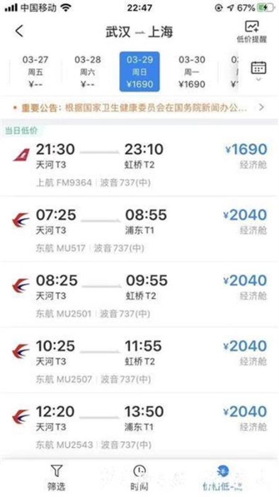 记者接到读者反映后,登录了携程、途牛、航旅纵横等订票APP。在这些软件上,确实出现了3月29日武汉飞上海的航班信息,包括东航等航空公司的航班。记者在软件上选择3月29日之前的日期,均显示“当日无航班”;而选择3月29日之后(含3月29日)的日期,则出现了时刻、航班号、机型等具体信息,并且可以点选支付按钮。