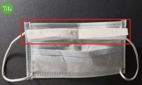 1、 将与口罩长度相当的纸巾折叠成条状,放在口罩金属条的下方。