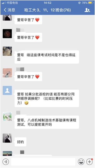 “抗‘疫’斗争,使我们共同经历着一次大考。”在2月27日至29日三天时间里,郭维萱先后为14个本科班级召开了线上班会,一一解答着同学们提出的各种问题,他告诉同学们,没有哪一场胜利是轻易得来的,一定要坚定信心、不畏疫情,时刻不要忘记“困难不怕,哈工大是家”。学生在他的带动下也纷纷投入到这场没有硝烟的战“疫”中,2017级本科生学生党员李鹏飞在家乡河北省小李庄村组织当地返乡大学生成立“返乡大学生志愿服务队”,助力当地疫情防控工作;在湖南长沙的2017级本科学生党员刘子轩所在的小区因疑似病例小区被封闭管理,但他依然积极乐观,与同学组成线上讲师团,在网上参与在线学业帮扶志愿活动。