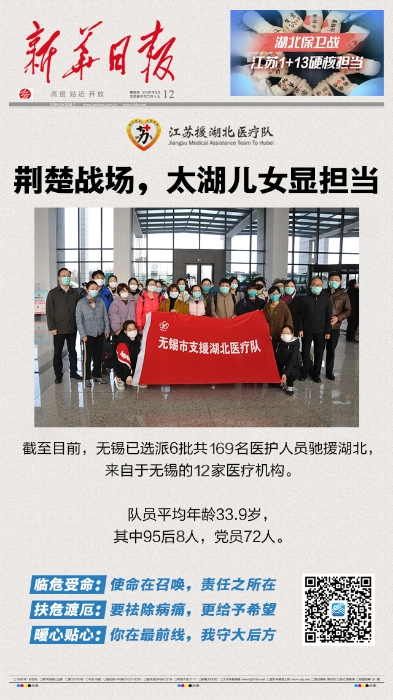龙泉出匣,勇士出征;国有征召,慷慨前行!新冠肺炎疫情暴发以来,截至3月4日,江苏已有2802名医护人员驰援湖北。日前,交汇点推出专题“湖北保卫战:江苏1+13硬核担当”,详细报道江苏省级医疗机构与13个设区市所属医疗机构的医务工作者,在湖北战“疫”最前线救死扶伤的恢弘场面。今日我们关注:《无锡:荆楚战场,太湖儿女显担当》。