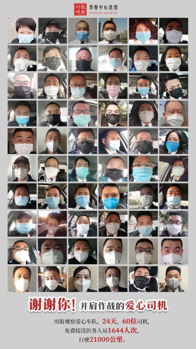 从2月19日至3月13日,川报观察爱心车队已走过22天,服务的医护人员已达1644人次,总里程约21000公里,这距离相当于跨越山海、横穿中国5次,比地球北极到南极还远。踊跃报名加入“爱心专车”的司机中,既有党员、退伍军人,也有普通群众,他们以这种方式,为疫情期间“逆行”的白衣天使们奉上自己特别的关爱。