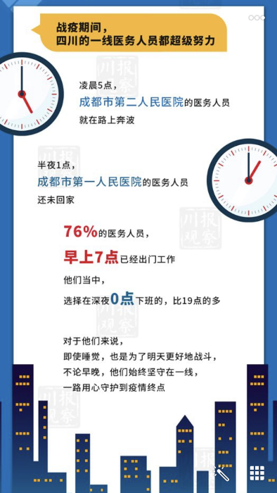 这一路,我们遇见的四川一线医务人员都超级努力。凌晨5点,成都市第二人民医院的医务人员就在路上奔波;半夜1点,成都市第一人民医院的医务人员还未回家;大部分医务人员,早上7点已经出门工作,他们当中,选择在深夜0点下班的,比19点的多。