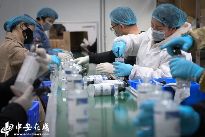 合肥高新区安徽启威生物科技有限公司的生产流水线上,工人们正在封装消毒凝胶。