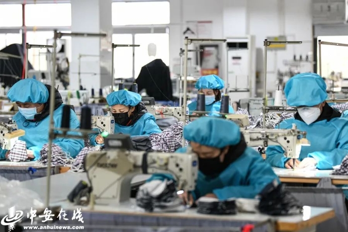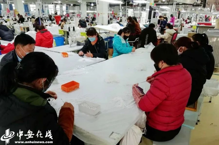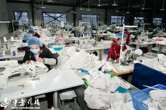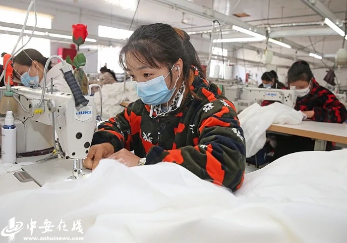 在阜阳市临泉县宋集镇扶贫车间的巨峰服饰公司,工人们正为生产订单产品而忙碌。