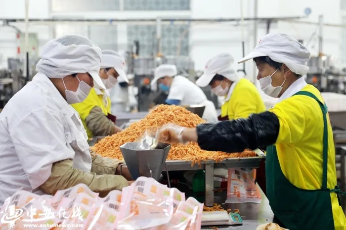 淮北辣魔王食品有限公司生产车间内,工人在加工休闲食品。