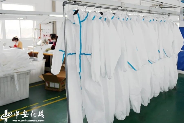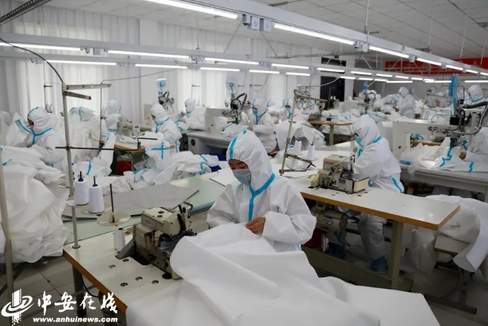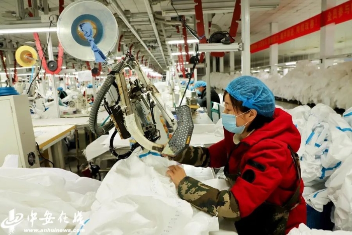 位于濉溪县经济开发区内的淮北新兴皇苑制衣有限公司,通过增加生产线、建立无菌生产车间,加班加点赶制医用防护服和口罩,助力抗击新冠肺炎疫情。