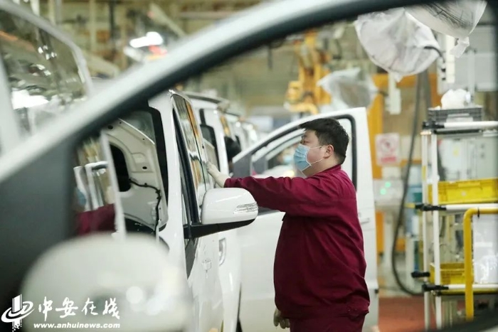 安徽(蒙城)江淮安驰汽车有限公司总装车间,工人正在流水线上检查刚下线的汽车,公司复工以来,全生产线开足马力保生产。