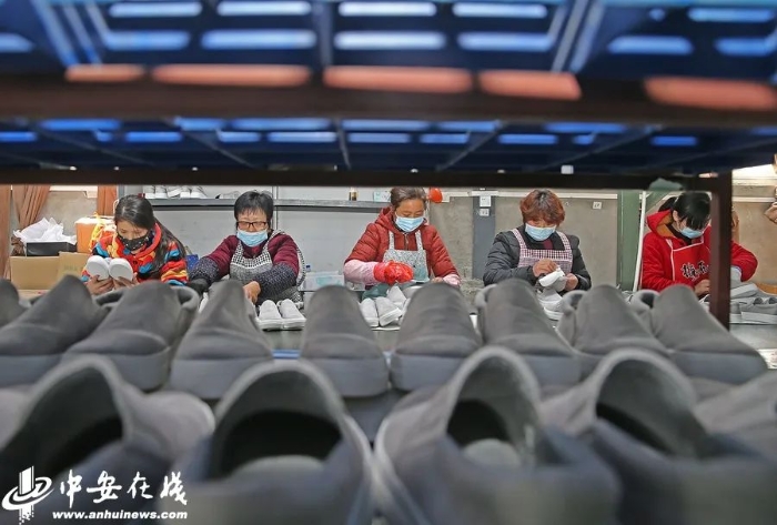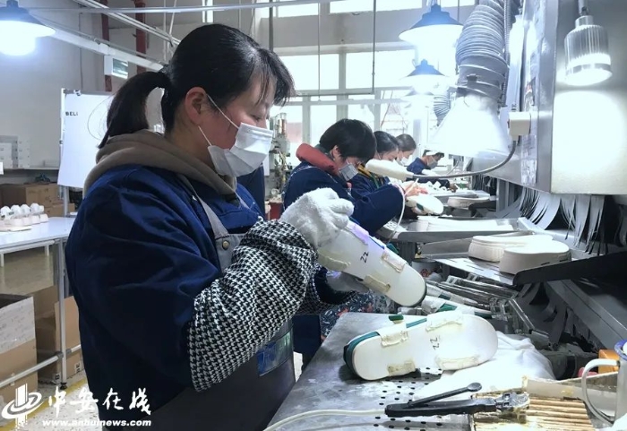 3月5日,淮南寿县宏卫鞋业有限公司的工人正在赶制一批出口日本的产品。该公司吸纳当地农民就业57人,其中贫困劳动者13人。