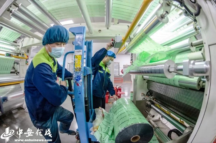 安徽汉邦日化有限公司的工人正在全自动湿纸巾生产流水线上作业。