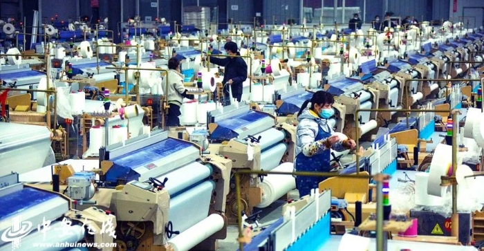 蚌埠五河县锐程纺织科技有限公司内,170多台喷水织布机正在加紧生产。