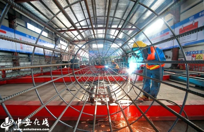 滁城丰乐大道与洪武西路交叉口附近的滁宁城际铁路二期工程钢筋加工区,电焊工人在对钢筋笼进行焊接作业。