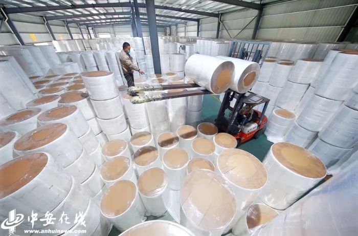 滁州琅琊经开区安徽金春无纺布股份有限公司,员工在仓库堆放待发货物。疫情发生以来,该企业8条生产线满负荷运行,为下游企业生产消毒湿巾提供材料,有力保障了防疫物资需求。