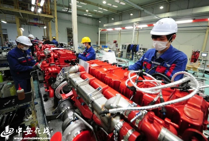 安徽(芜湖)玉柴联合动力股份有限公司生产车间 ,生产线上工人正在紧张地操作。