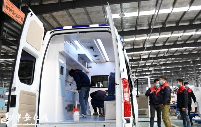 安徽奇瑞瑞弗工作人员加紧负压救护车的生产 ,为抗疫提供物资保障。
