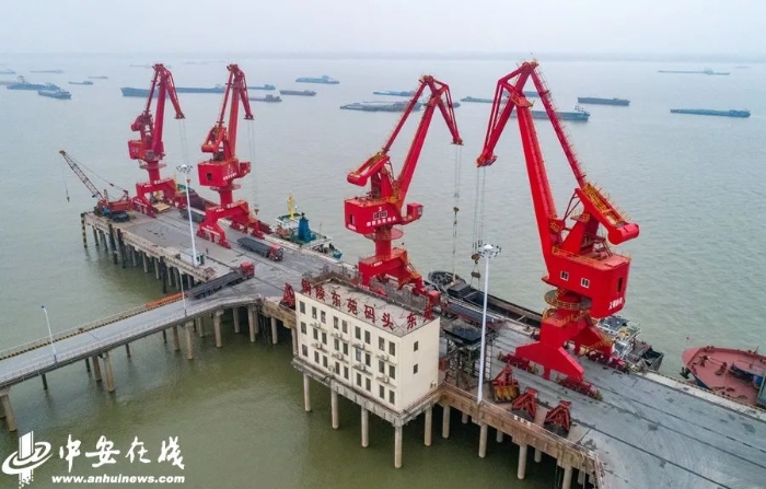 位于安徽省铜陵市郊区长江横港港区的东苑码头,卡车、货船和吊机不断地往复作业,一派忙碌景象。
