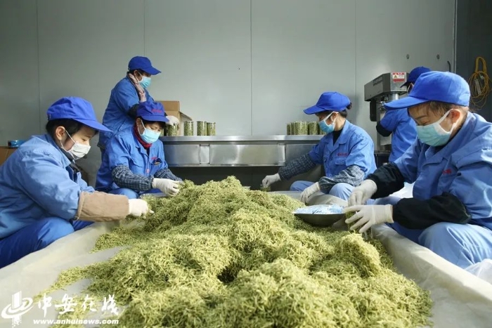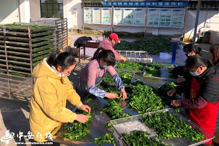 安徽黄山徽州区西溪南镇石桥村蔬菜烘干车间,员工们正在挑拣烘干菜心。