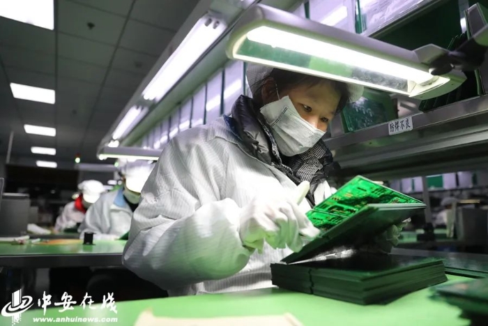在铜陵经开区的铜陵安博电路板有限公司生产车间,工人在对生产出来的电路板进行检测。