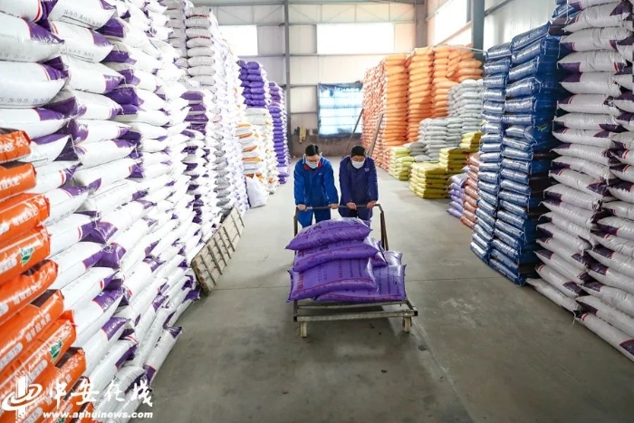2月25日,池州市汇丰农资有限公司,工作人员正在搬运化肥。
