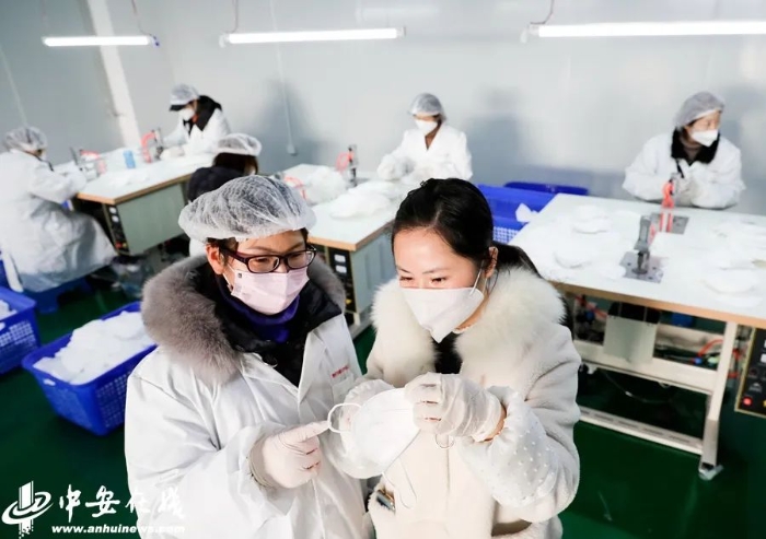 合肥市蜀山区经济开发区的一家户外用品公司,生产线转产生产口罩,为防疫提供物资保障。