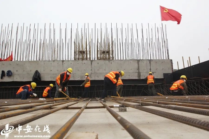 3月3日,引江济淮工程安庆枞阳枢纽节制闸工程的施工现场,工人正在安装底板钢筋。