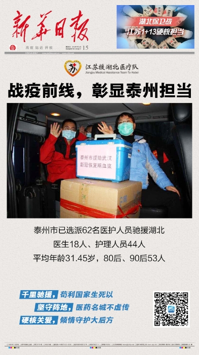 ——忘不了,2月24日晨曦初露,泰州第5批出征的是心理援助医疗队:泰州市第四人民医院的成栋、荀坤平,兴化市第四人民医院的陈芳。他们这次携带泰州新冠肺炎康复者秦先生捐献的血浆前往湖北。“党和国家花了这么多人力物力财力,把我们治愈了,我只能通过捐献血浆的方式来回报社会,感谢党和国家!”秦先生说。