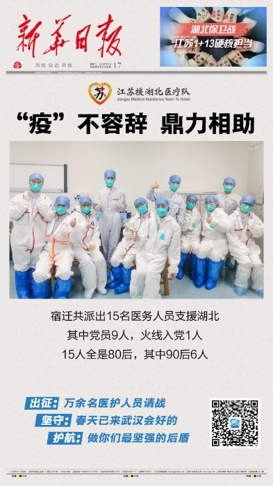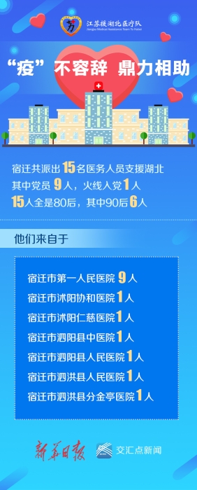尽管医疗卫生“家底”相对薄弱,但当这场没有硝烟的战“疫”在荆楚大地打响之后,重情重义的宿迁以举鼎之豪气和锐气,立即连夜征集医护人员,组建赴湖北抗击疫情医疗队。这支由80后、90后组成的15人队伍,来自于宿迁市、县7所医院。带着家人的叮咛与泪水、领导的嘱托和祝福,他们背起简单的行囊,踏上了驰援湖北歼“疫”的不平凡征程。