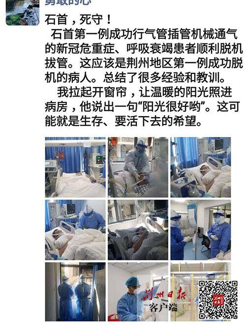 从出病房到回驻地,孙小聪一直表现得很平静,队员打招呼也只是呵呵一笑。但是,当晚发出一条朋友圈消息,透露出他的激动:“这应该是荆州地区第一例成功脱机的病人,总结了很多经验和教训。我拉开窗帘,让温暖的阳光照进病房,他说出一句‘阳光很好哟’,这可能就是活下去的希望。”