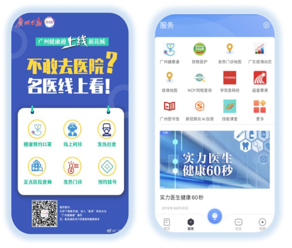 为减少市民出门的感染几率,方便市民足不出户即可线上问诊,2月12日,广州市卫健委“广州健康通”正式上线“新花城”服务板块,一键就可以get“穗康”“线上问诊”“发热自查”等多项实用服务。