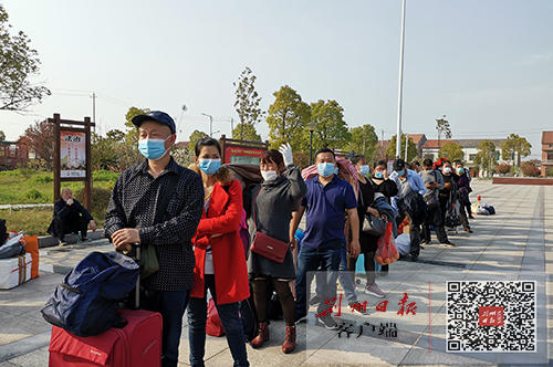 3月20日,荆州区“点对点”助力返岗、一站式就业服务在弥市镇正式启动。96名弥市籍外出务工、返岗人员,挥别亲人们,由荆州区政府买单,分别免费乘坐4辆客运车,赶赴广东东莞复工上岗。