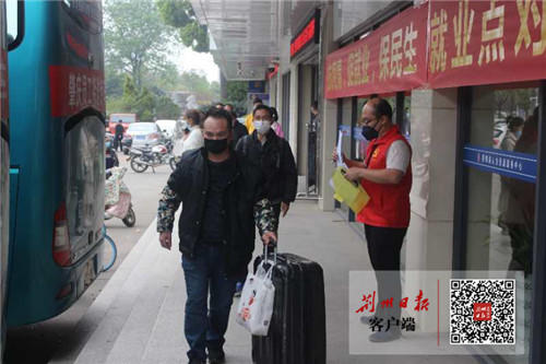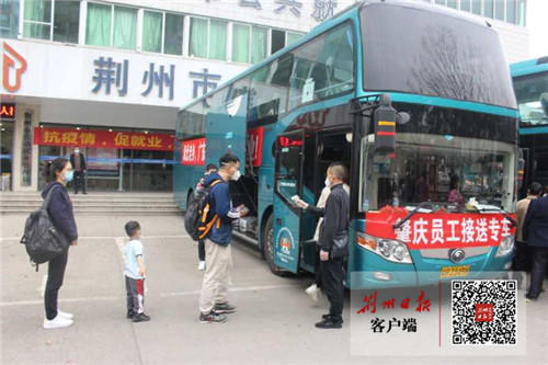 广东肇庆匹思通、山鹰纸业、光电设备、邦丽建材等10家公司派专车迎接44位荆州籍职工返岗到各企业上班,并安排了随车人员做好服务。47岁的石首人何建设将与10多位荆州籍同事一起返岗,何师傅高兴地说,他已在广东肇庆匹思通公司做了9年的精密铸造工人,月薪近5000元,属高温作业。这是他和同事们第一次乘坐由