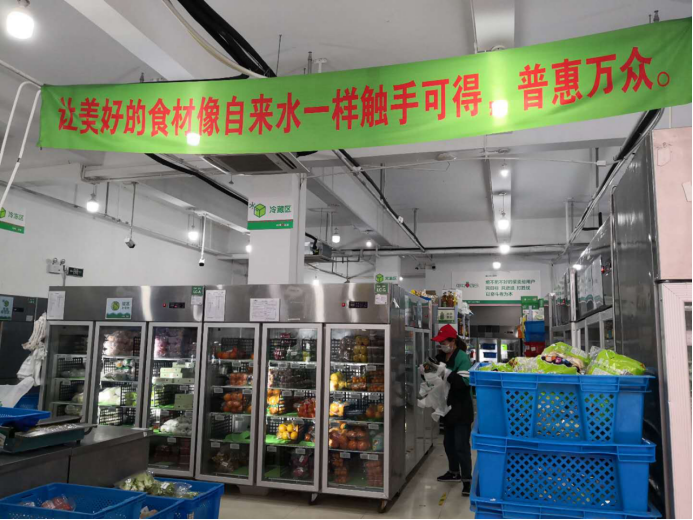 叮咚买菜上海联洋前置仓里,分拣员忙着从冷藏柜中按单取货。谢卫群摄