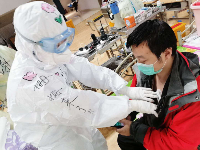 图为方舱医院的医生为患者接上心电终端,实时传输ECG全数据到云平台。微创公司提供