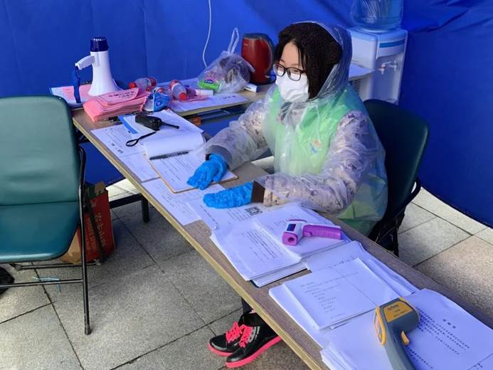 今年2月,康城小区门口的社区志愿者负责进出人员的检测登记。闵行区供图