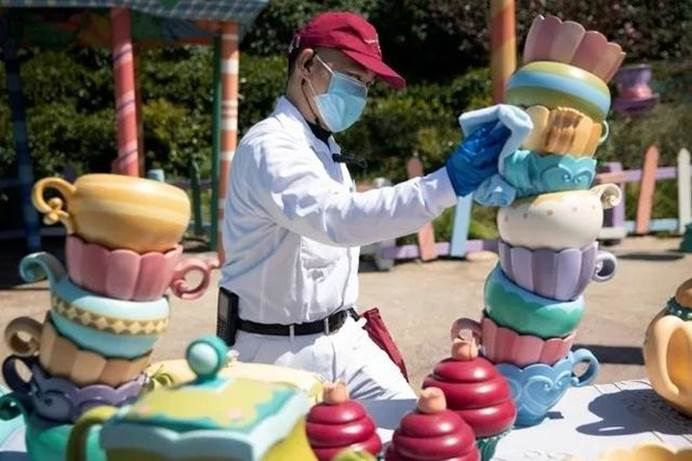 上海迪士尼乐园重启当天,工作人员在做清洁。资料图片