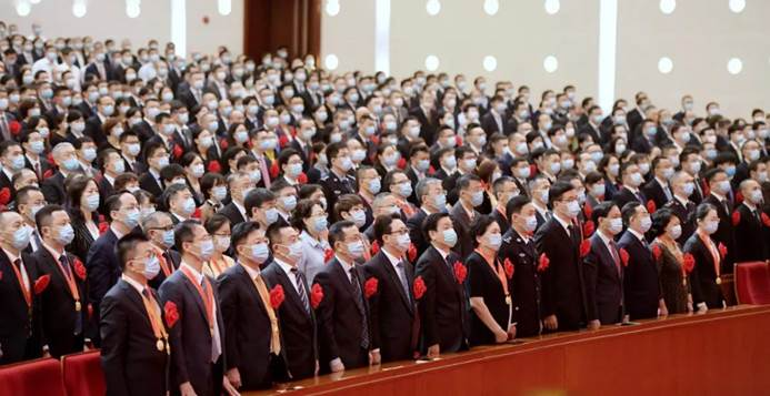 上海市抗击新冠疫情表彰大会开幕,全场与会者起立奏唱国歌。陈正宝摄