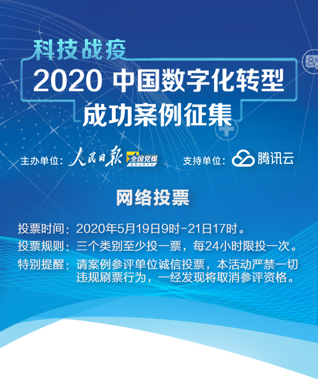 为深入贯彻落实党中央重要指示精神,总结推广疫情防控场景下应用案例成功典型,人民日报全国党媒信息公共平台联合腾讯云发起科技战疫——2020中国数字化转型成功案例征集,通过对案例的征集梳理,宣传好经验好做法,推广好典型好标杆,以开拓创新模式,引领行业发展,充分发挥数字技术的支撑作用,促进技术的普惠应用,助推新兴产业创新升级。